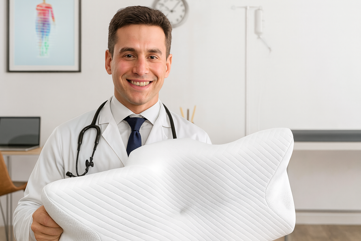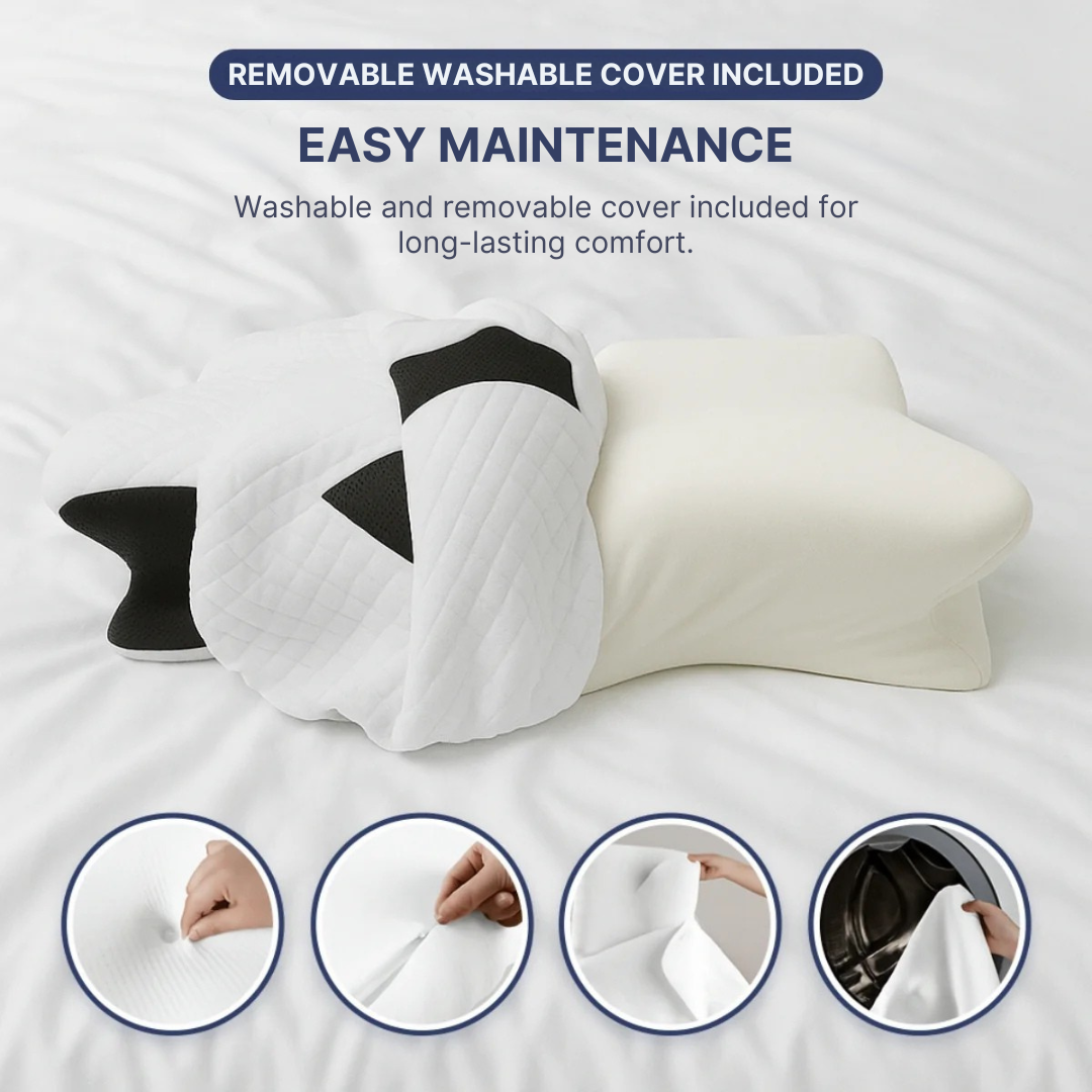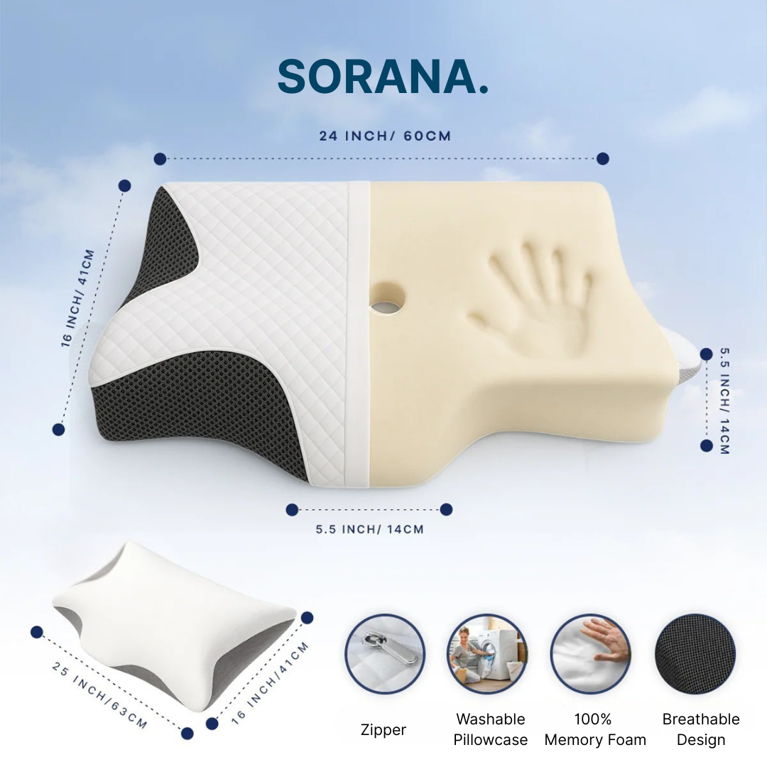 The Sorana ErgoRelief™ Pillow is engineered with an ergonomic butterfly contour that supports your cervical spine (C1–C7) in its natural curve — especially at the critical C5–C6 segment where most stiffness and nerve compression occur.